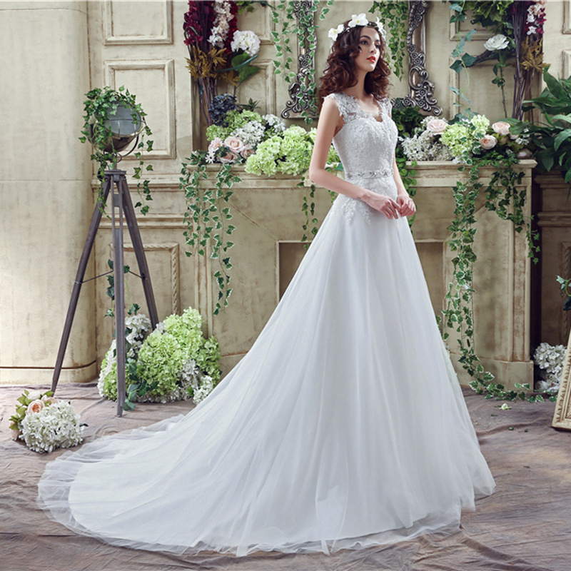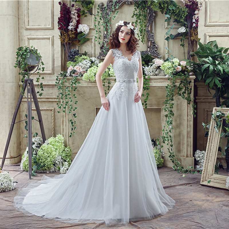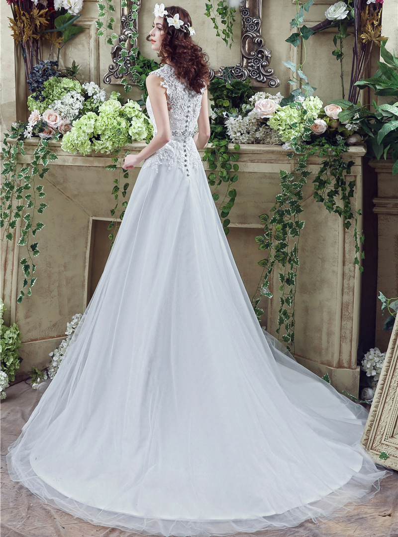 Applique V Neck Sweep Train Wedding Dresses With Rhinestone Belt 8489515666#