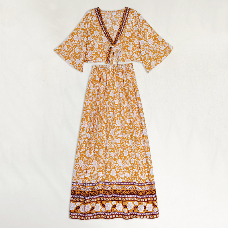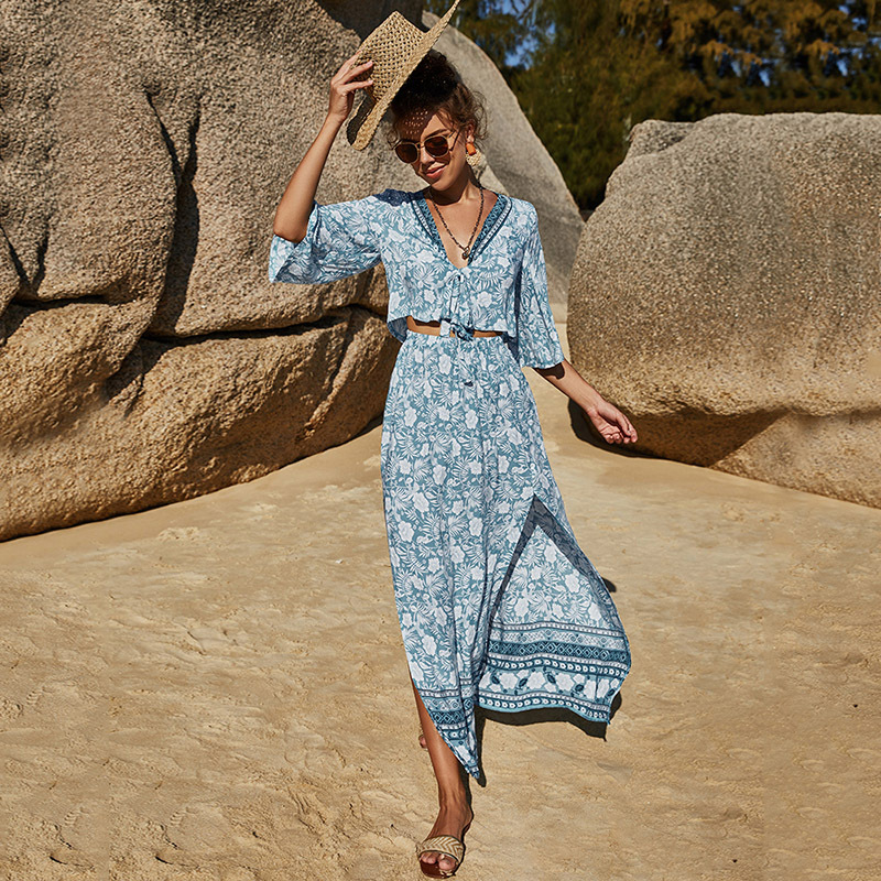 Boho Floral Plunging Crop Top & Split Thigh Skirt Set #88211592175