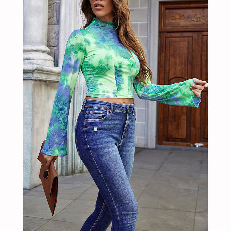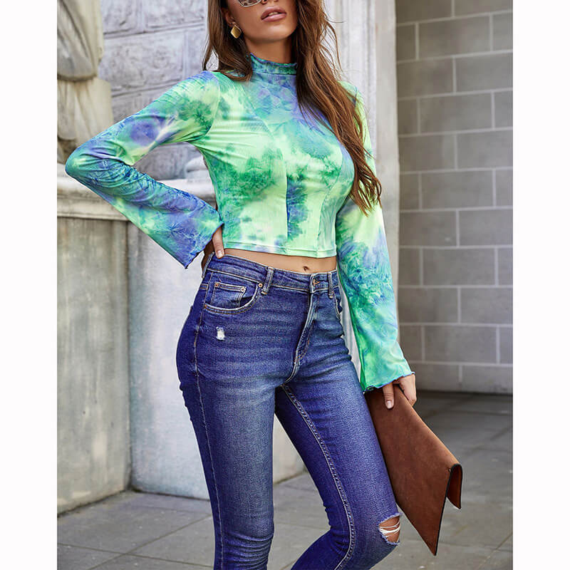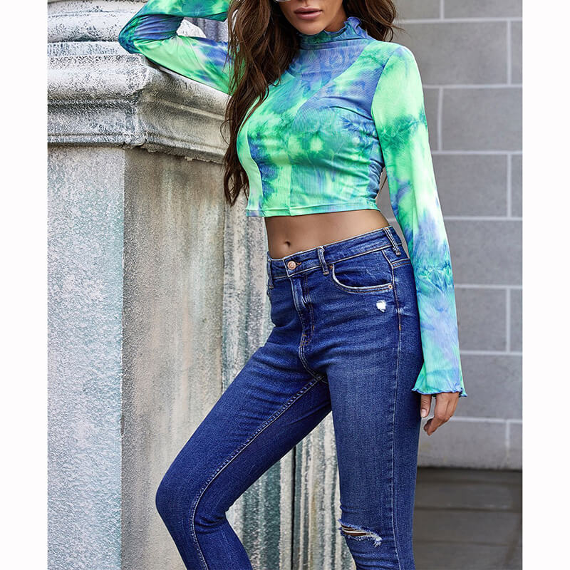 • Mock Neck Tie Dye Crop Top Shirt 88211592426#