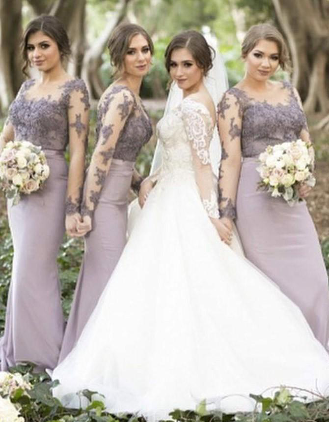• New Arrival Lilac Dresses Mermaid Long Sleeve Sweep Train Bridesmaid Gowns With Lace Applique Illusion Back 8394453637#