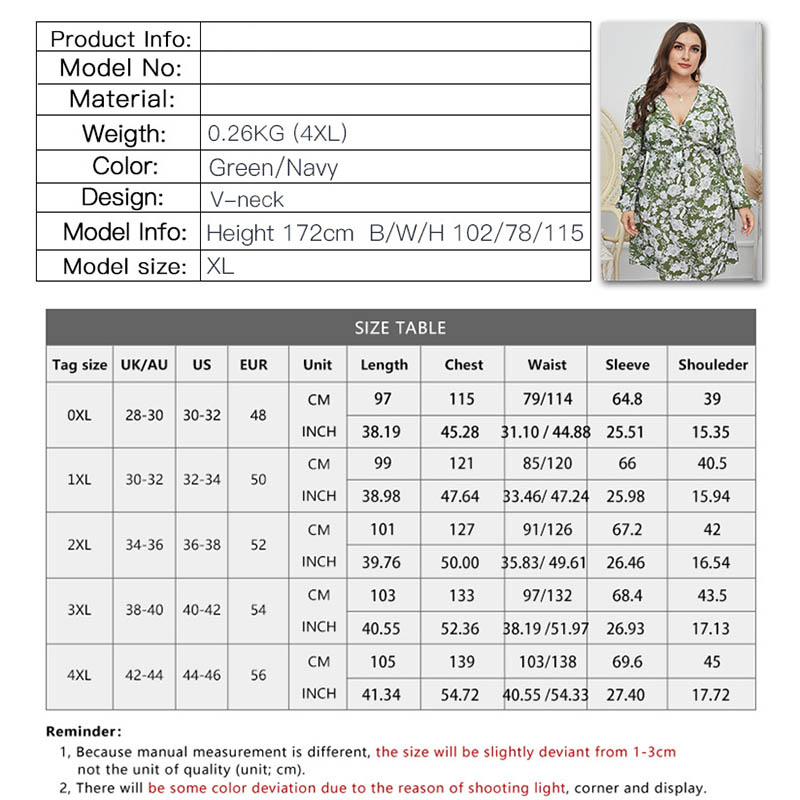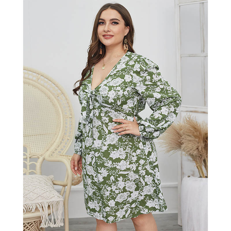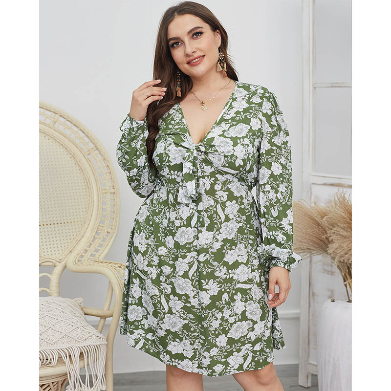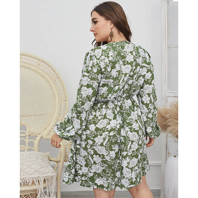 • Plus Floral Print V Neck A-Line Dress in Green 88211592119#
