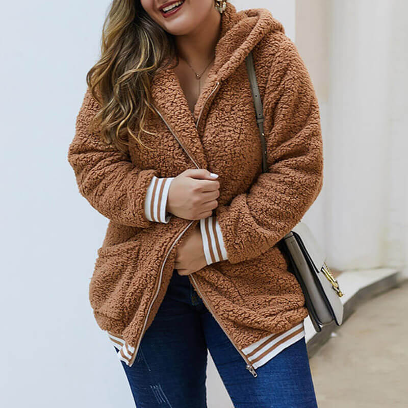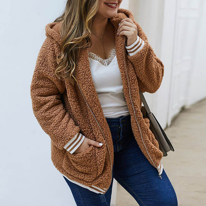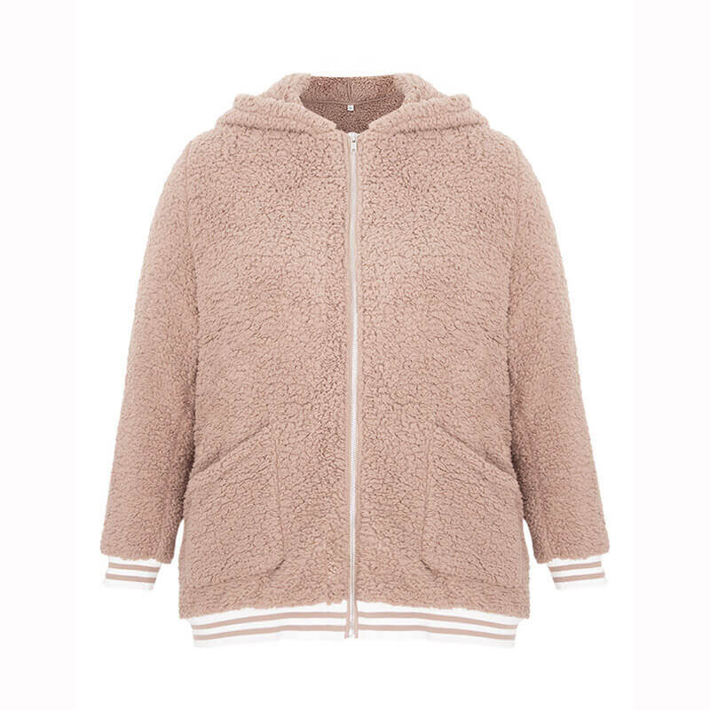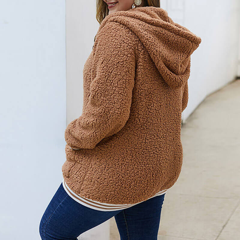 Plus Size Teddy Hooded Cardigan Jacket 88211592402#