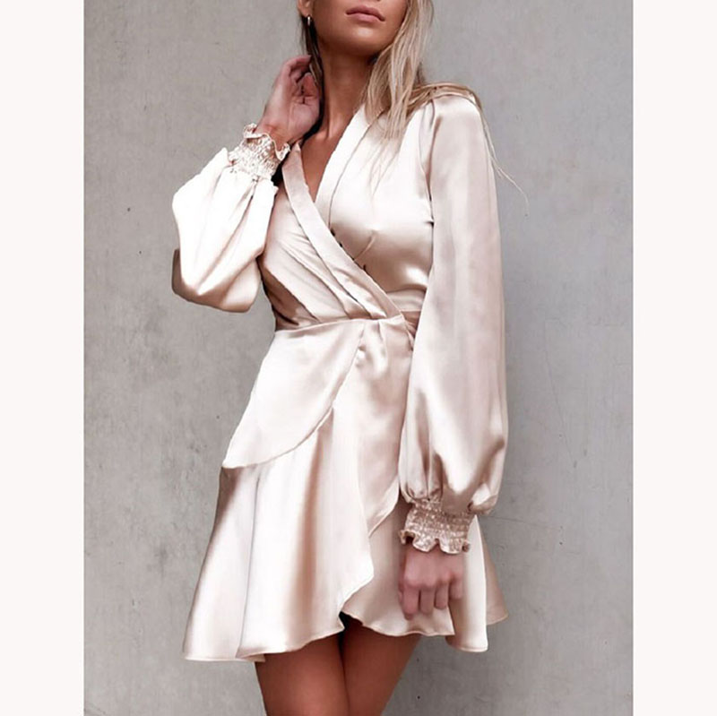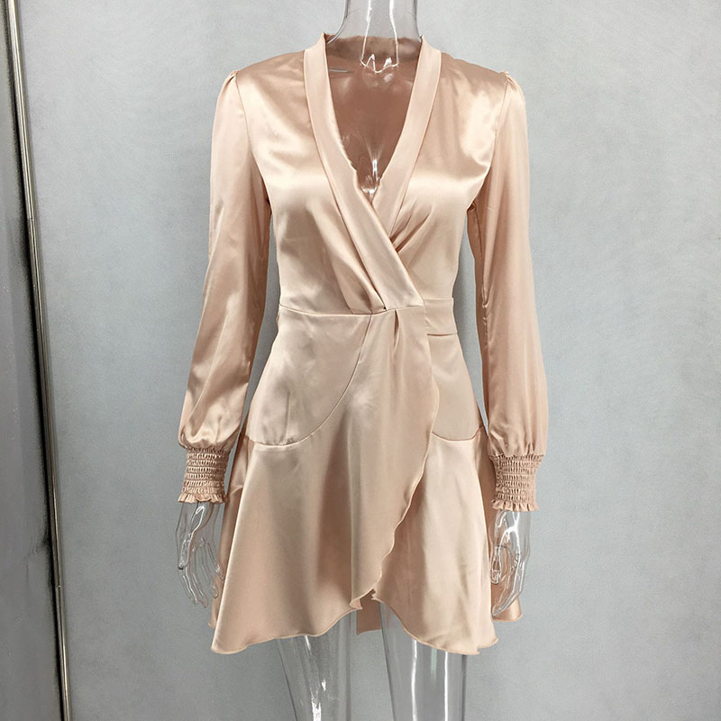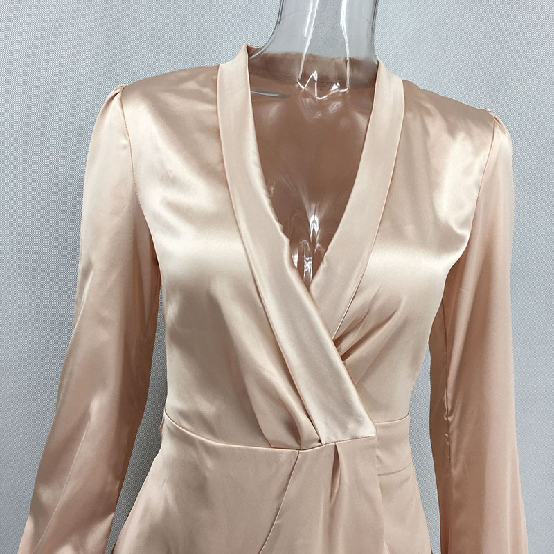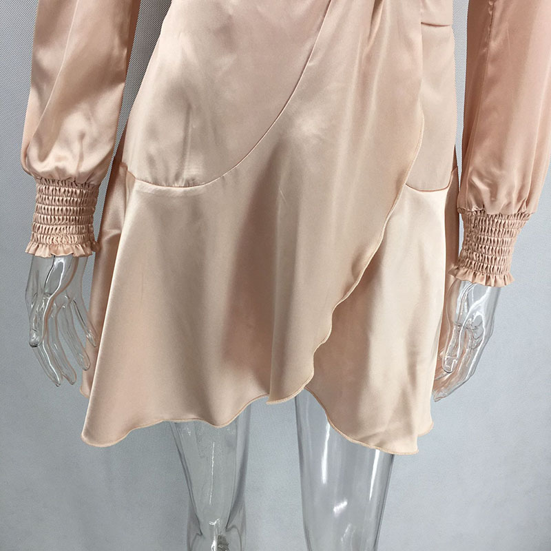 • Shawl Collar Self Belted Asymmetrical Hem Wrap Satin Dress 88211592275#