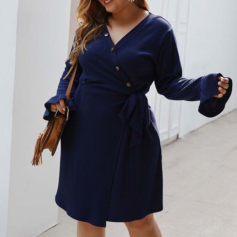 Solid V Neck Tie Wrap Dress Plus Size 88211592432#