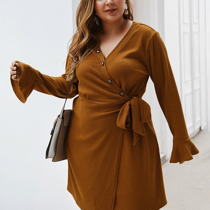 • Solid V Neck Tie Wrap Dress Plus Size 88211592432#