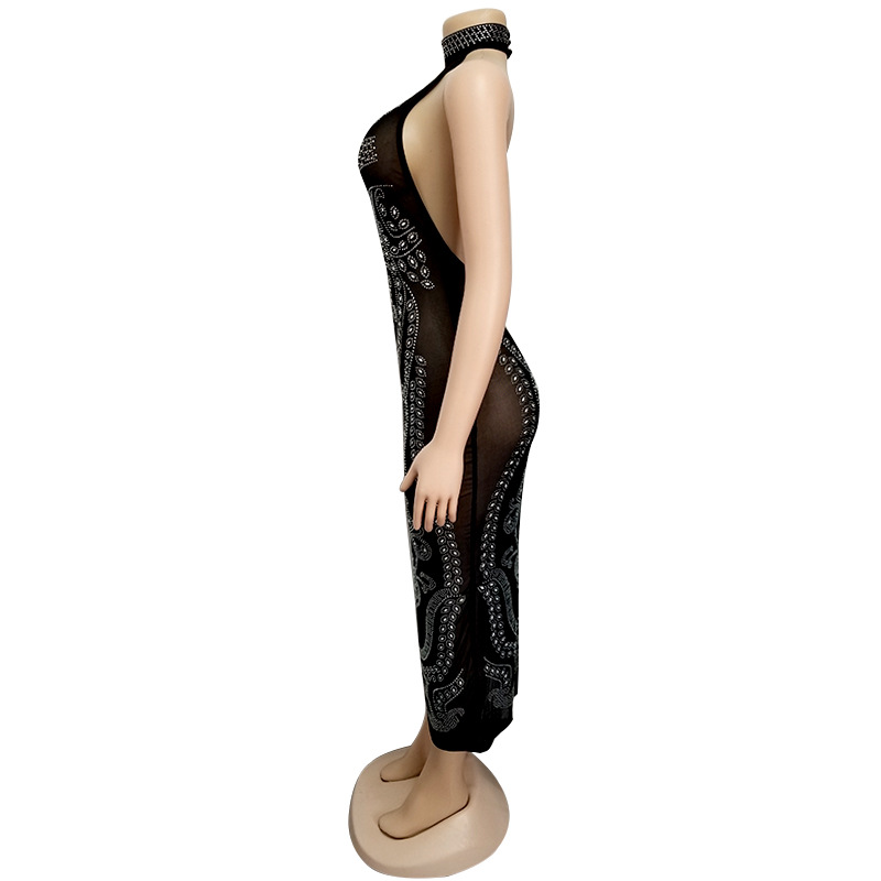 • Sparkling Black Midi Bodycon Backless Dress 88211592325#
