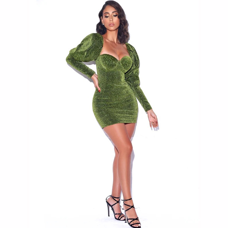 • Sparkling Green Puff Sleeve Mini Bodycon Dress 88211592294#