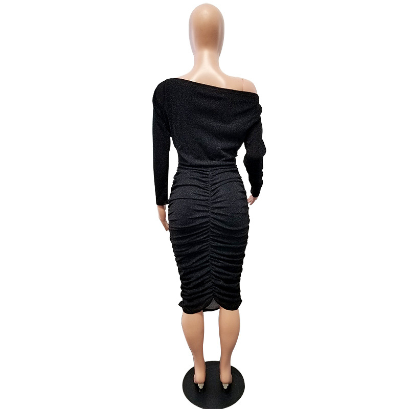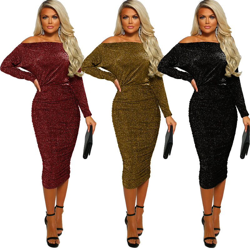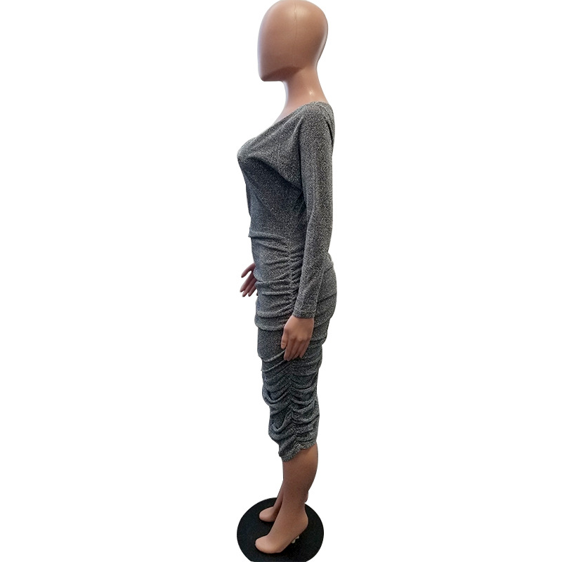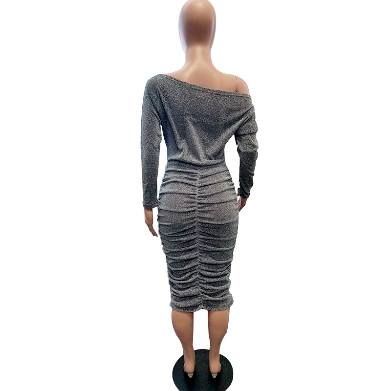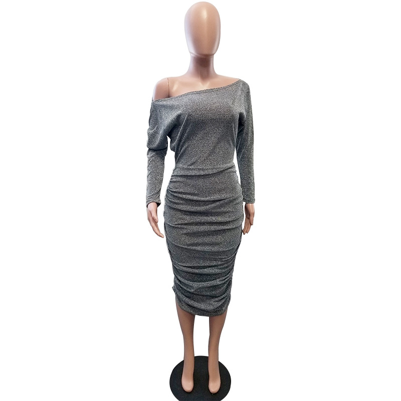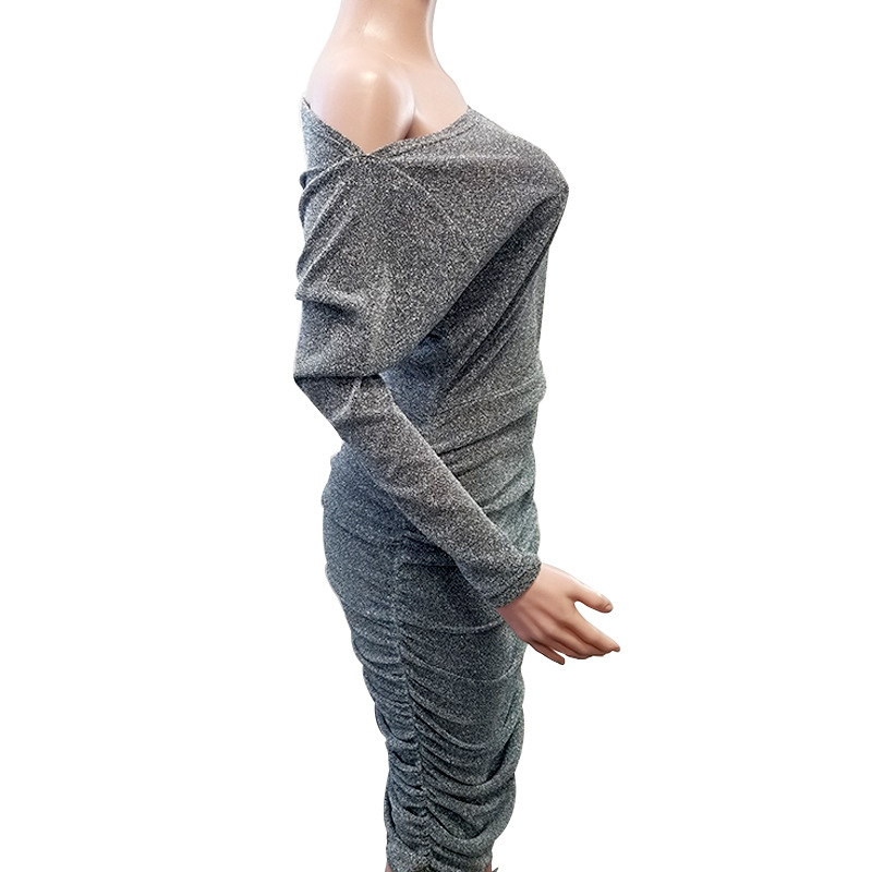 Sparkling Off Shoulder Ruched Long Sleeve Midi Dress 88211592331#