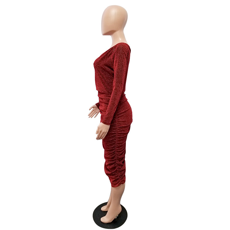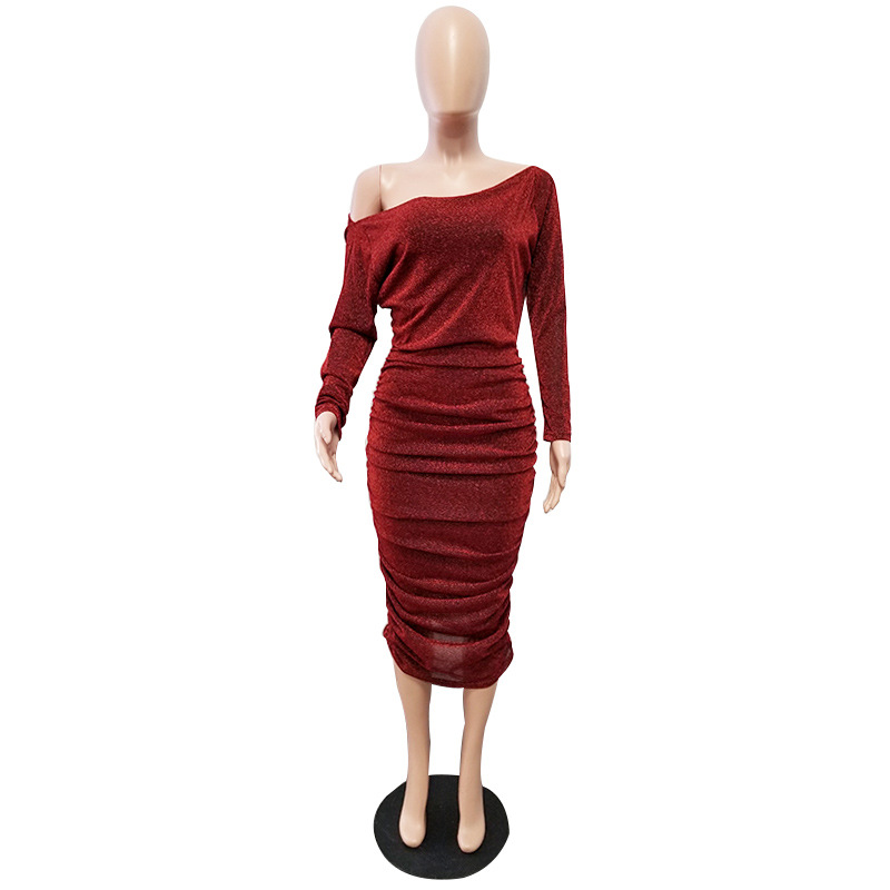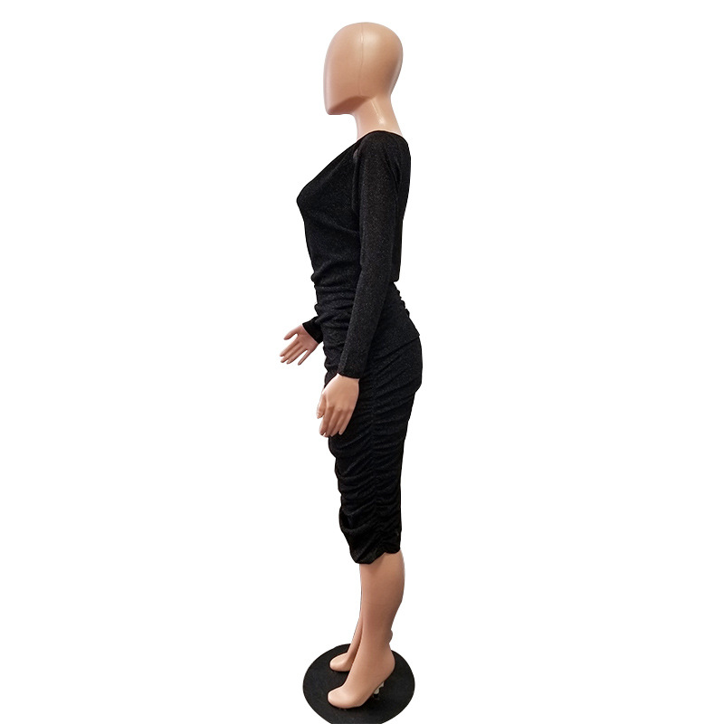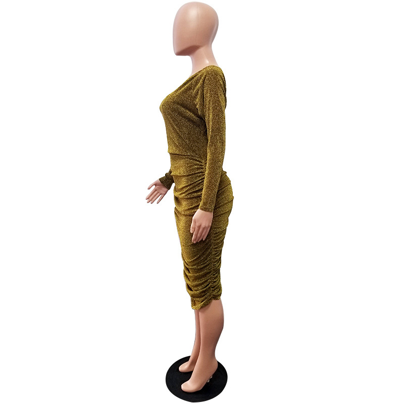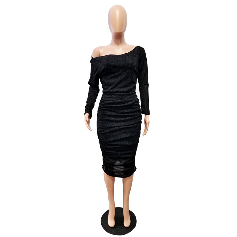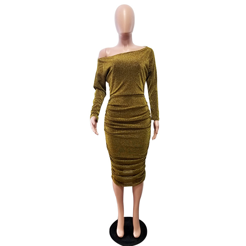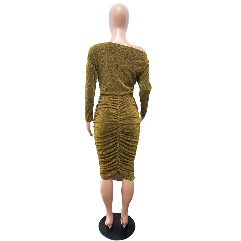 Sparkling Off Shoulder Ruched Long Sleeve Midi Dress 88211592331#