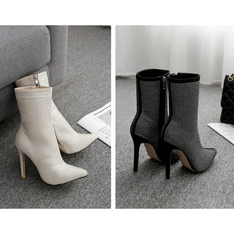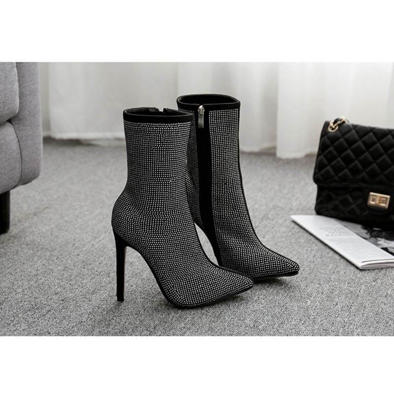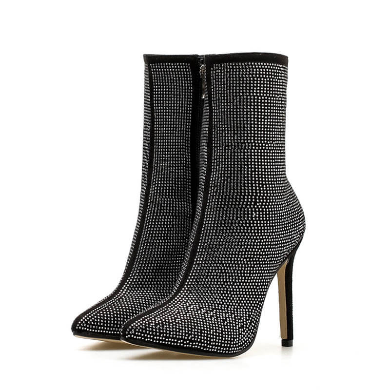 • Sparkling Rhinestones Mid Calf Stiletto Heel Boots in Black #88211592454