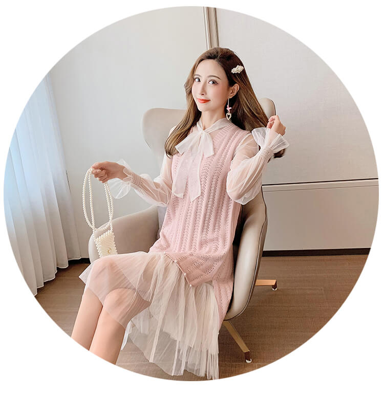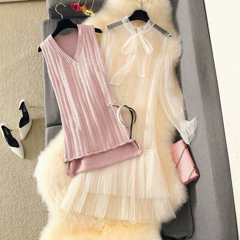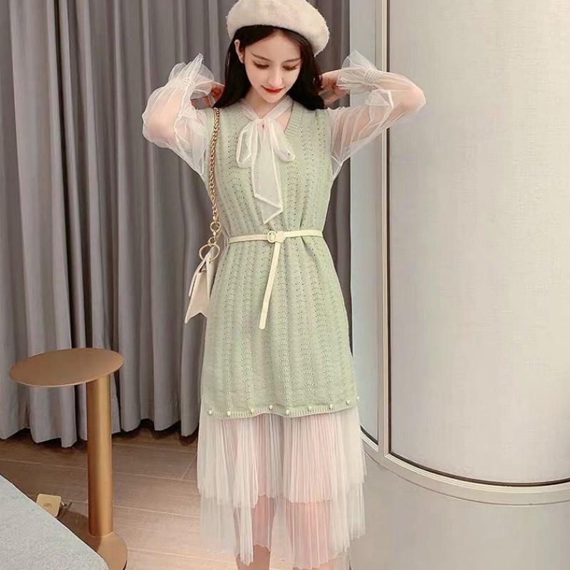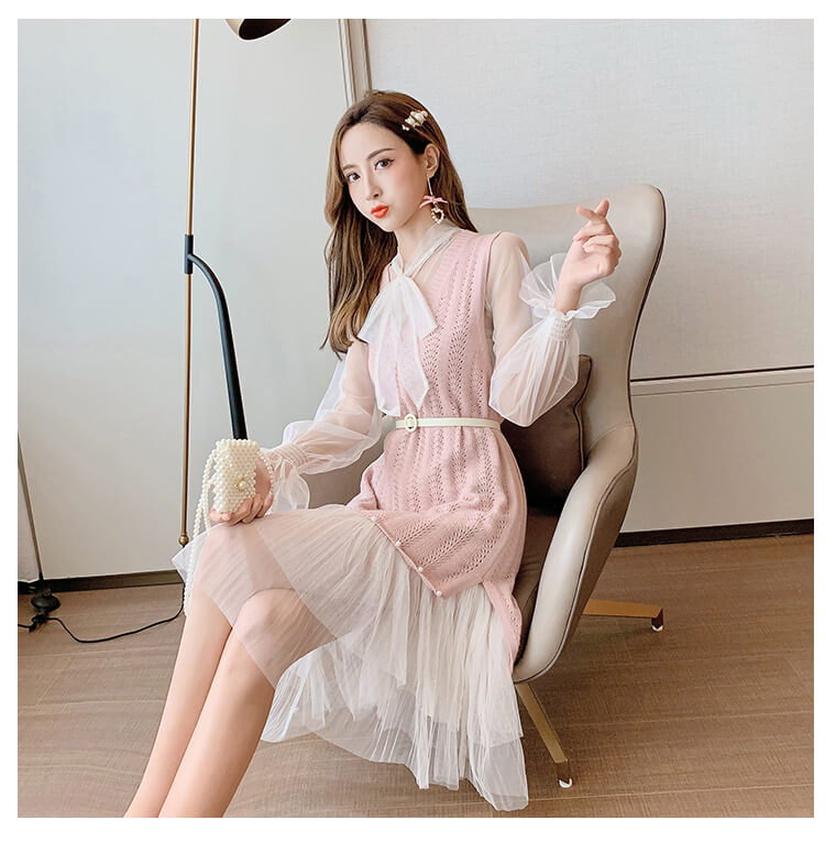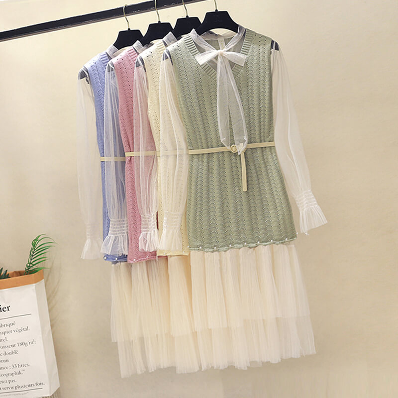 Spring Autumn Women's V Neck Sweater with Tulle Long Dress Real 2pcs 8395238899#