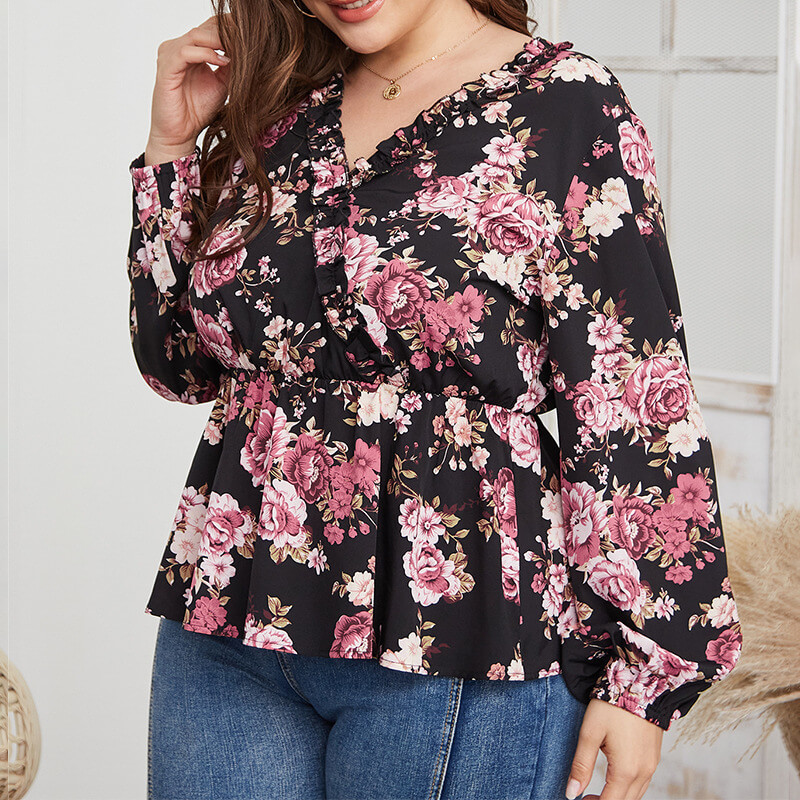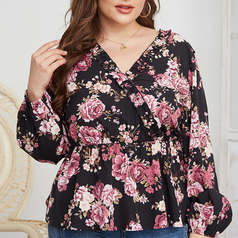 V Neck Floral Print Blouse Top Plus Size 88211592439#