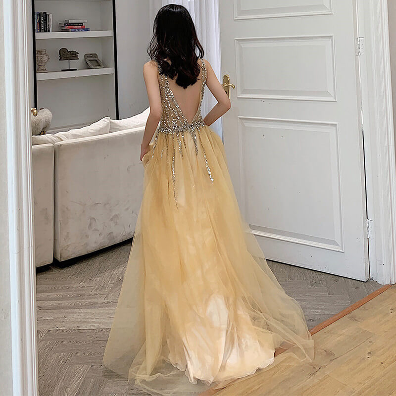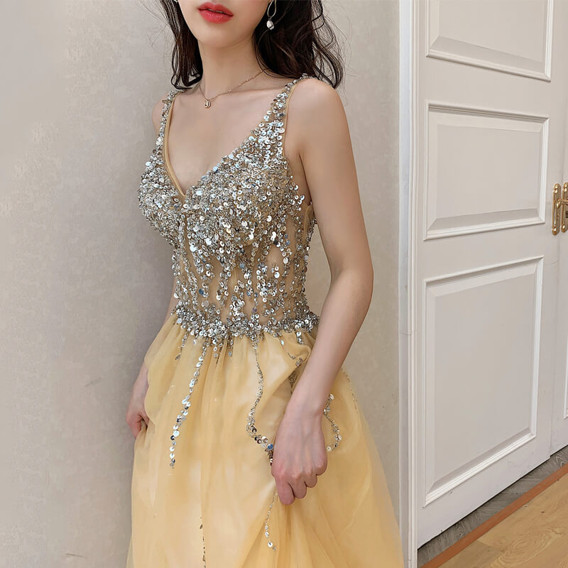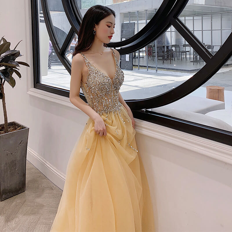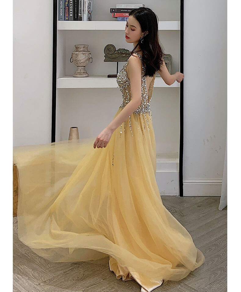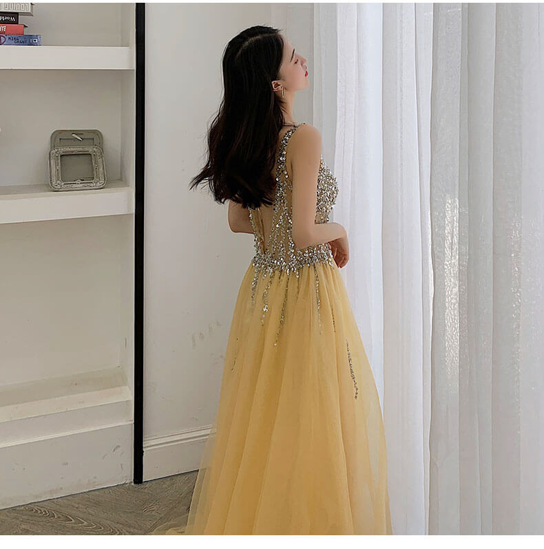 • Yellow Deep V Neck Backless Wedding Evening Gowns 8470138400#